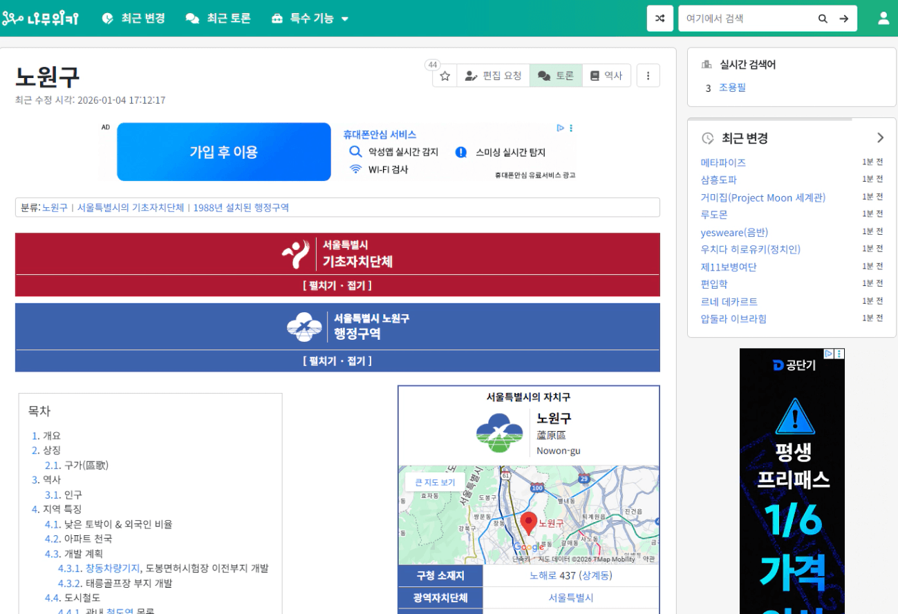 검색은 주로 나무위키에서 지역명을 검색하시면