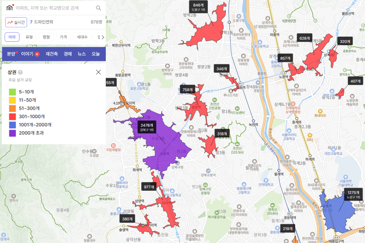 호갱노노에서 분석 기능을 활용해 “상권”과 “학원가”의 위치를 확인하고
