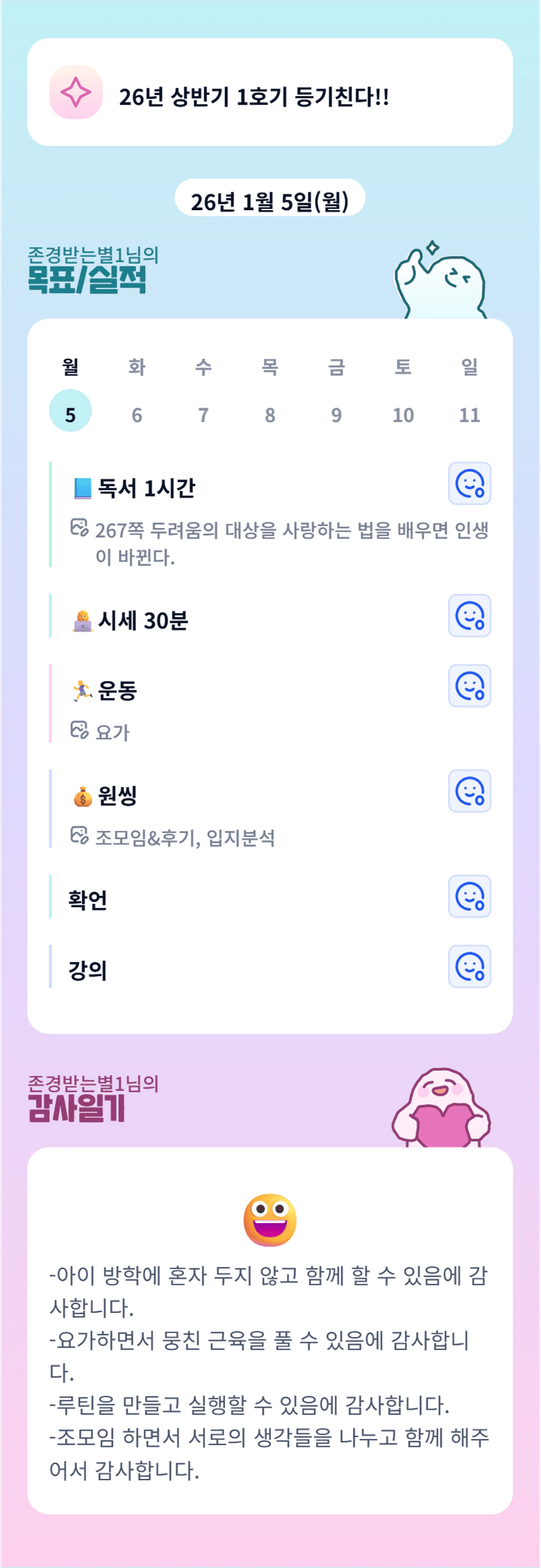 루틴을 설정하고 꾸준히하는게 정말 중요한데 별님은 할 수 있습니다! 파이팅하세요!!