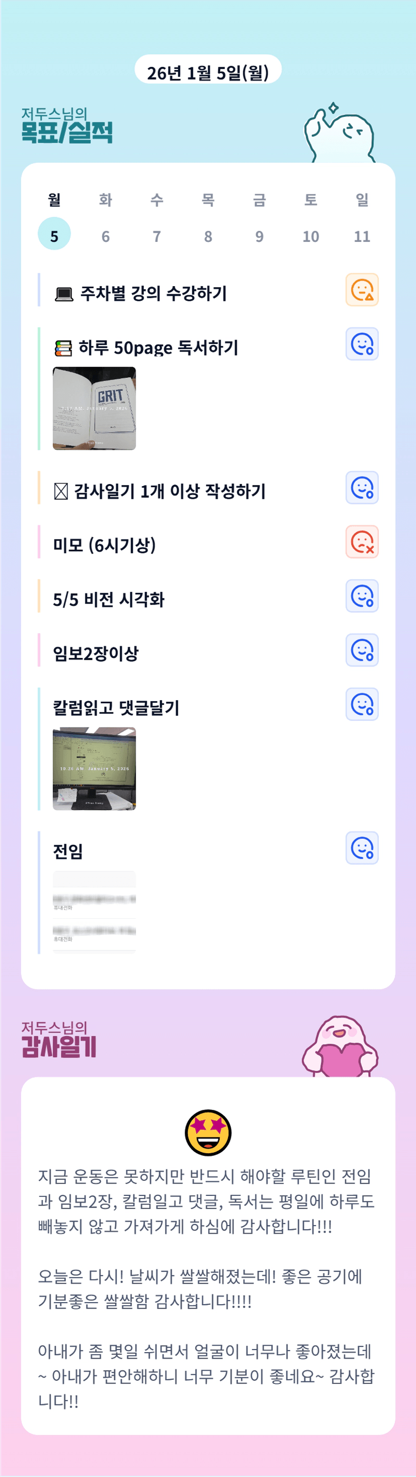 와~ 두스님 목실감에 사진인증까지 대단하십니다!! 루틴지키는거 정말 쉽지 않은데 유리공까지 관리하시며서 정말 대단하신거 같아요~ 사임전까지 화이팅입니다^^