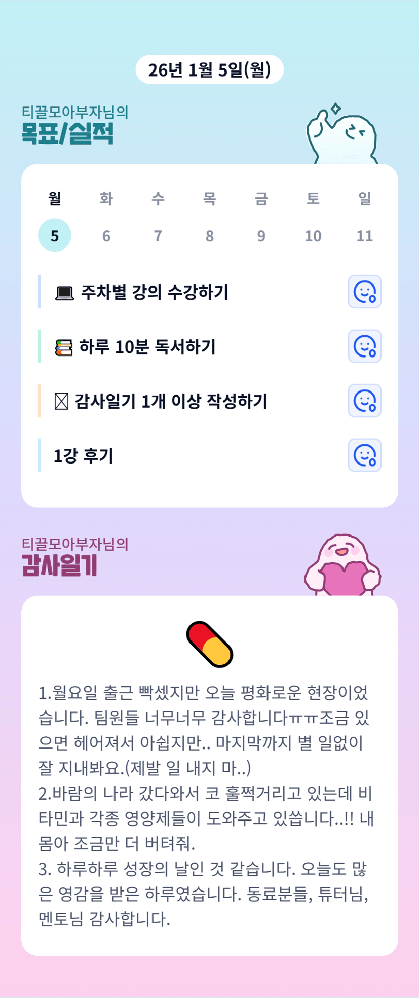 티부님 하루하루 성장의 날~!! 너무 멋지다!! ㅎㅎㅎㅎ 화이팅입니다!