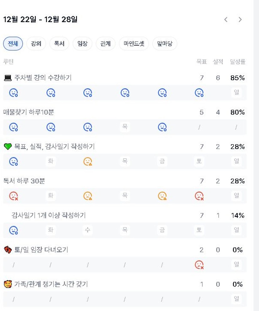 제대로 못해서 마음이 불편함에도 몸상태 회복이 먼저라 아쉬움이 남지만 중간중간 책도 읽고 강의를 열심히 들으려고 노력한 부분에 대해 스스로 토닥이며 다음주는 좀 더 실천할 수 있는 한 주가 되길