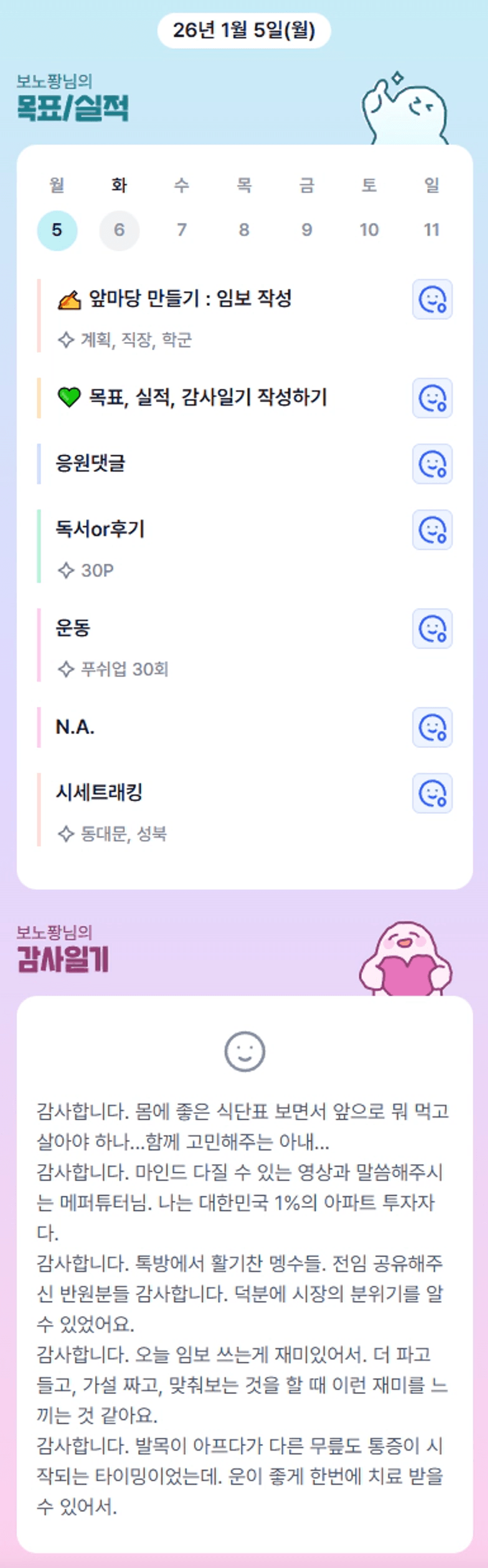 몸 아픈 곳이 몇 군데 있으신가 봅니다 ㅠㅠ 건강 챙기면서 같이 해봐요 ㅎㅎ