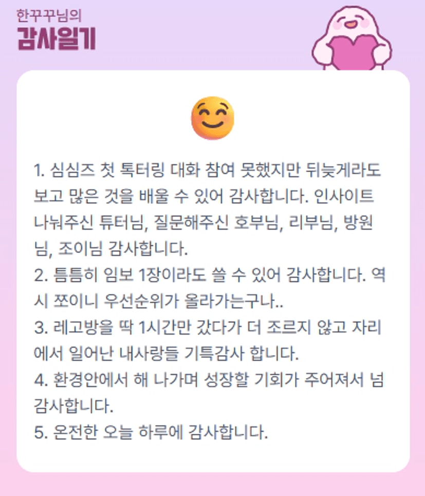 꾸꾸님도 질문 남겨주신 덕분에 튜터님의 좋은 답변 들을 수 있었어요 ㅎㅎ 감사합니다 :) 고생하셨습니다!!