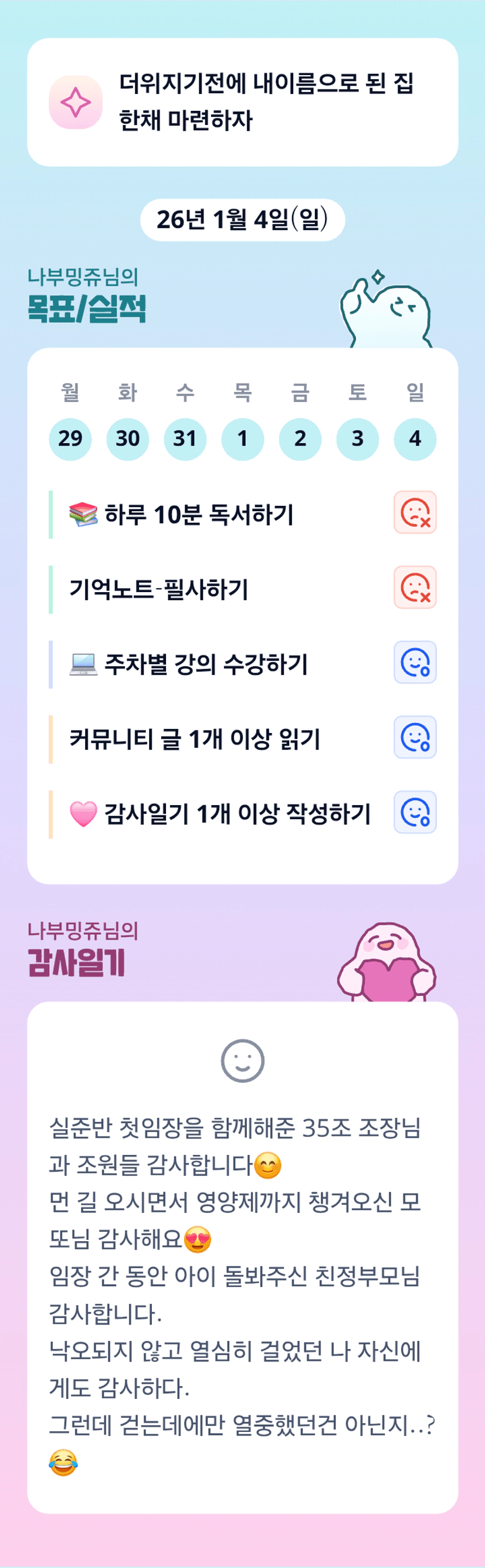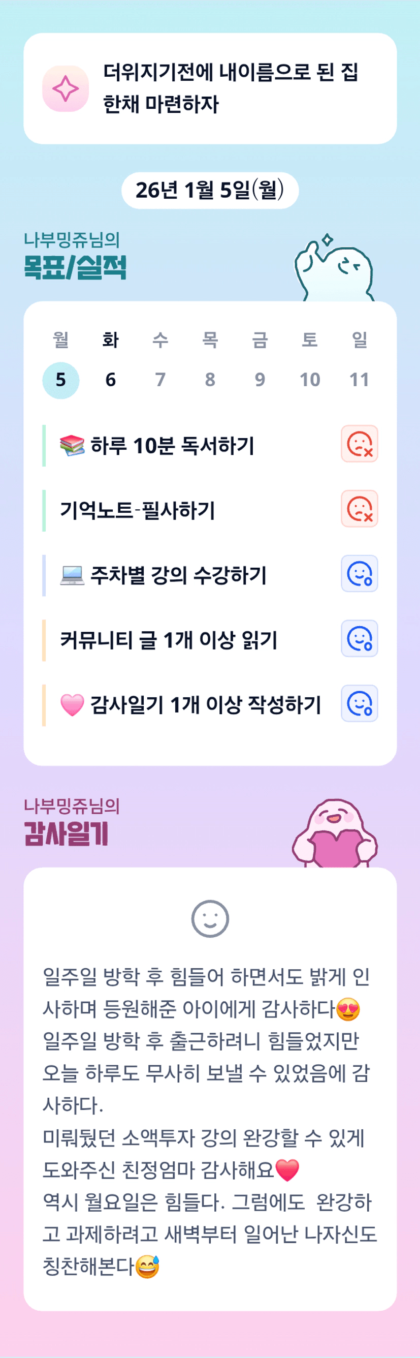 친정엄마 최고최고~~ 완강한 나부밍쥬님도 최고~~~ 첫임장은 저 다리를 못쓰겠더라고요..ㅋ.ㅋ 오전오후 다 해냈다는 것 자체가 대단하십니다!! 과제까지 파이팅^^!
