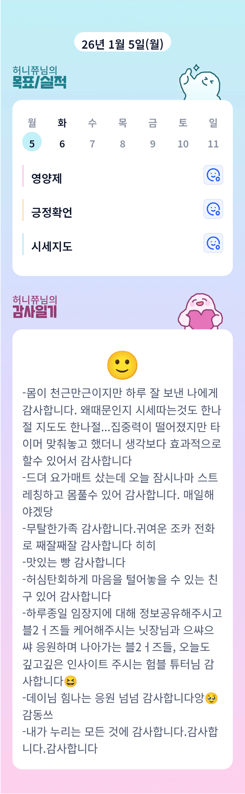 쮸님~ 감사가 풍성해서 좋아요 그 감사로 좋은 에너지 얻어 파워 업 힘내세요.