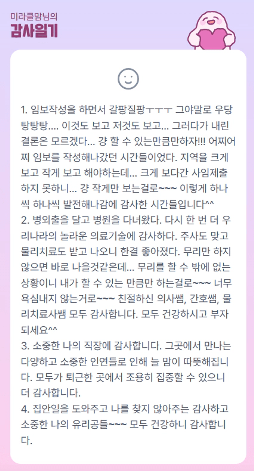 ㅎㅎㅎ 몸이 괜찮아지셔서 다행입니다~~ 이번주는 중요한 주이니 화이팅 해봐요!! 맘님~