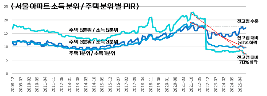 하위 20%의 소득자들이 서울에서 하위 20% 가격 아파트를 구입한다고 할 때 현재 PIR 수준은 전고점 대비 -70%로 낮습니다. 현재 서울의 하위 가격의 아파트들은 매우 저렴한 가격을 형성하고 있고 할 수 있습니다.