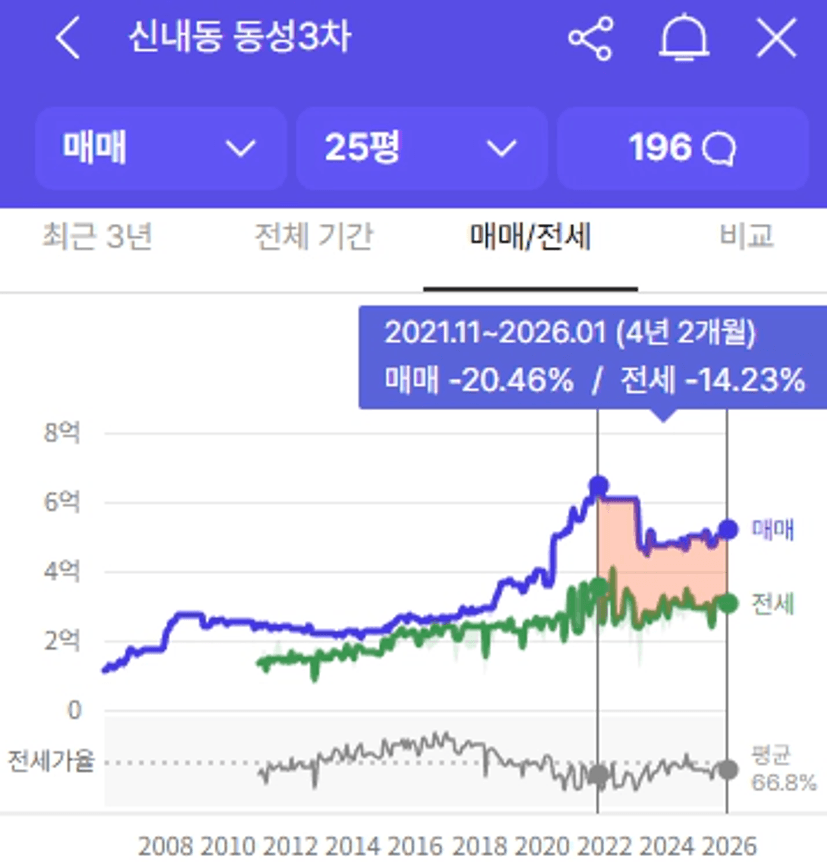 서울 아파트 1분위의 평균 가격인 5억에 해당하는 대표 단지로 신내동성3차 25평 가격을 확인해보면 전고점 대비 -20%로 아직 전고점에 미치지 못한 것을 볼 수 있습니다.
