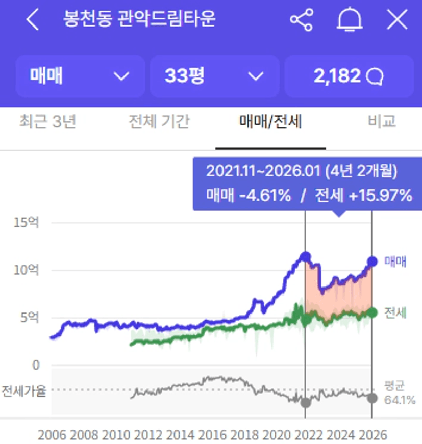 서울 아파트 3분위 평균 가격 11.2억에 해당하는 대표 단지로 관악드림타운 30평대 가격을 확인해보면 전고점 대비 -5%로 아직 전고점에 미치지 못한 것을 볼 수 있습니다.