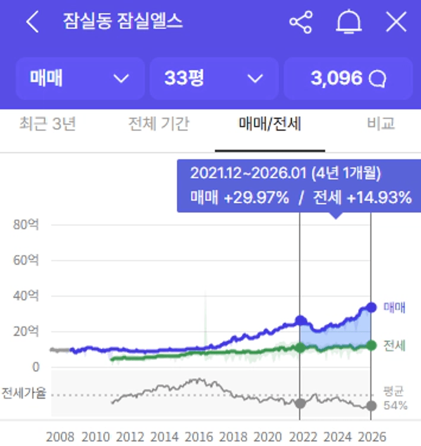 서울 아파트 5분위의 평균 가격인 34.3억에해당하는 대표 단지로 잠실엘스의 30평대 가격을 확인해보면 전고점 대비 30% 이상 가격이 상승한 것을 살펴볼 수 있습니다.