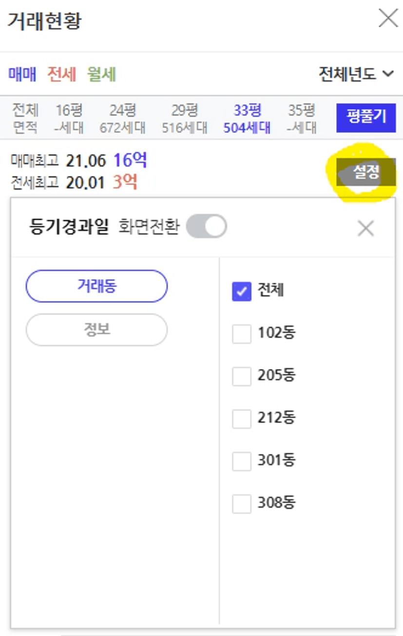 1. 동별 선호도를 확인하고 싶은 단지를 하나 선정하고 (만약 없다면 대장)