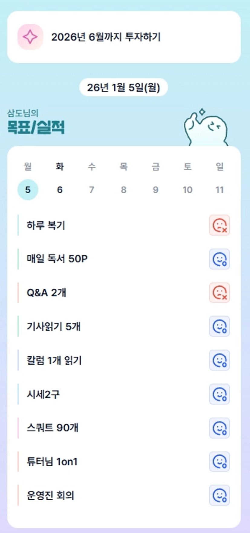 2. 적투 튜터님과 1on1을 통해서 앞으로 3개월 성장 목표를 잡아나갈 수 있음에 감사합니다. 투자 경험을 더욱 많이 쌓으라는 말씀에 힘입어 나의 투자뿐만 아니라 다른 사람의 투자에도 적극적으로 행동하도록 하겠습니다.