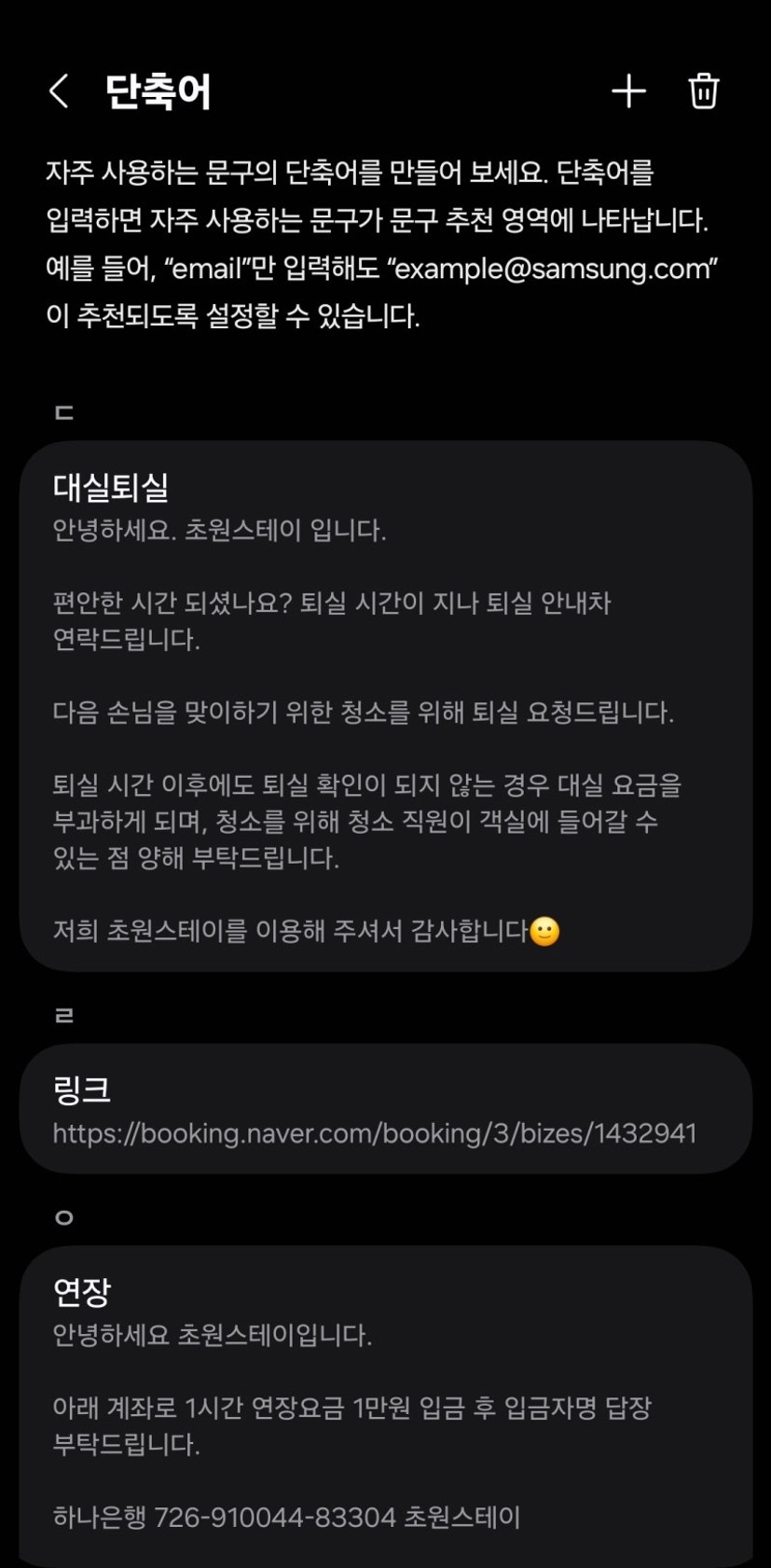 ์ด ๊ธฐ๋ฅ์ ์ค์ > ์ผ๋ฐ > ์ผ์ฑ ํค๋ณด๋ ์ค์ > ๋จ์ถ์ด์ ๋ค์ด๊ฐ ์์ฃผ ์ฐ๋ ๋ต๋ณ๋ค์ ํ ๋ฒ ๋ฑ๋กํด ๋์ผ๋ฉด,