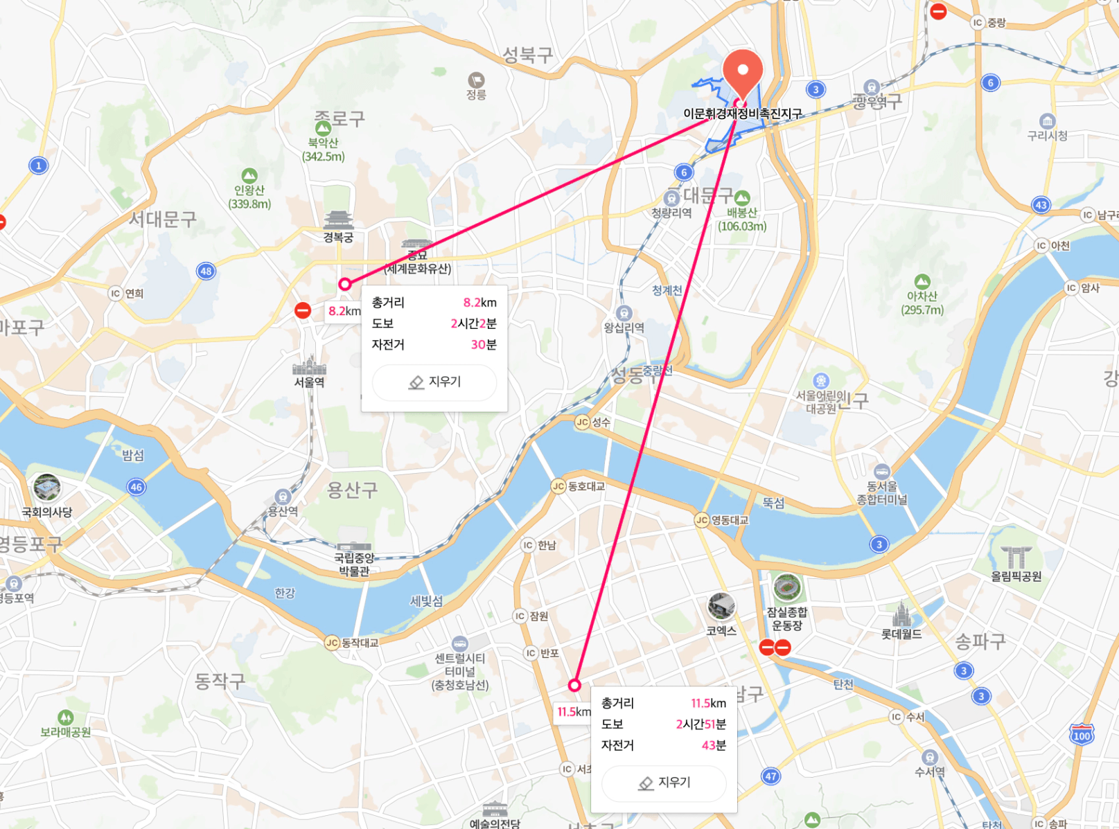 시청 8.2km, 강남 11.5km 정도로
