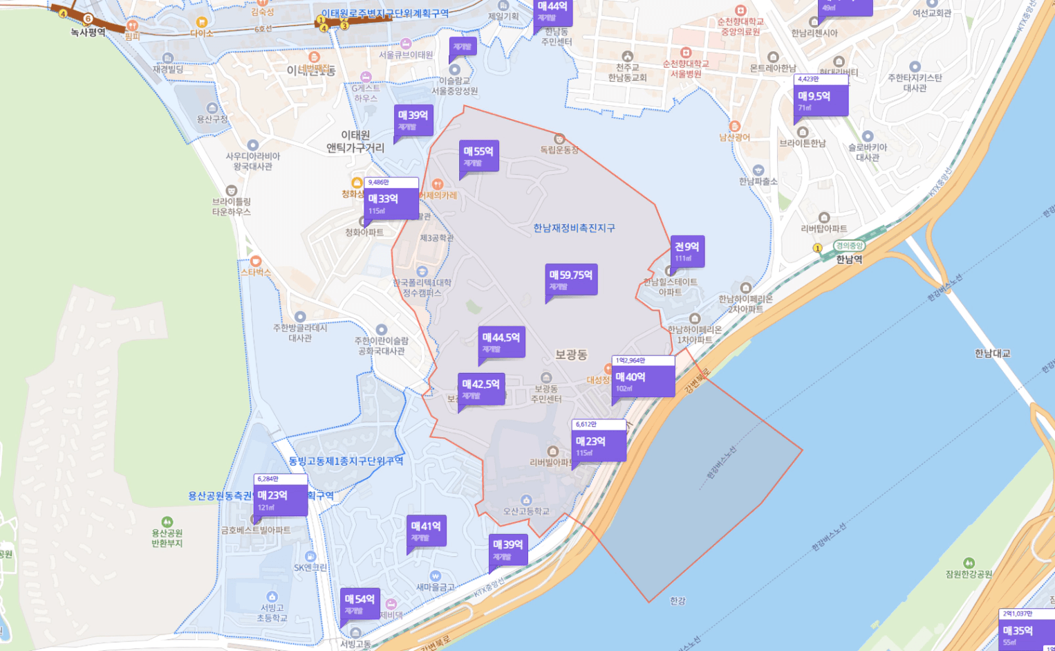 한남뉴타운은 20~50억대로 성수 전략정비구역과 비슷한 가격대를 형성하고 있습니다.