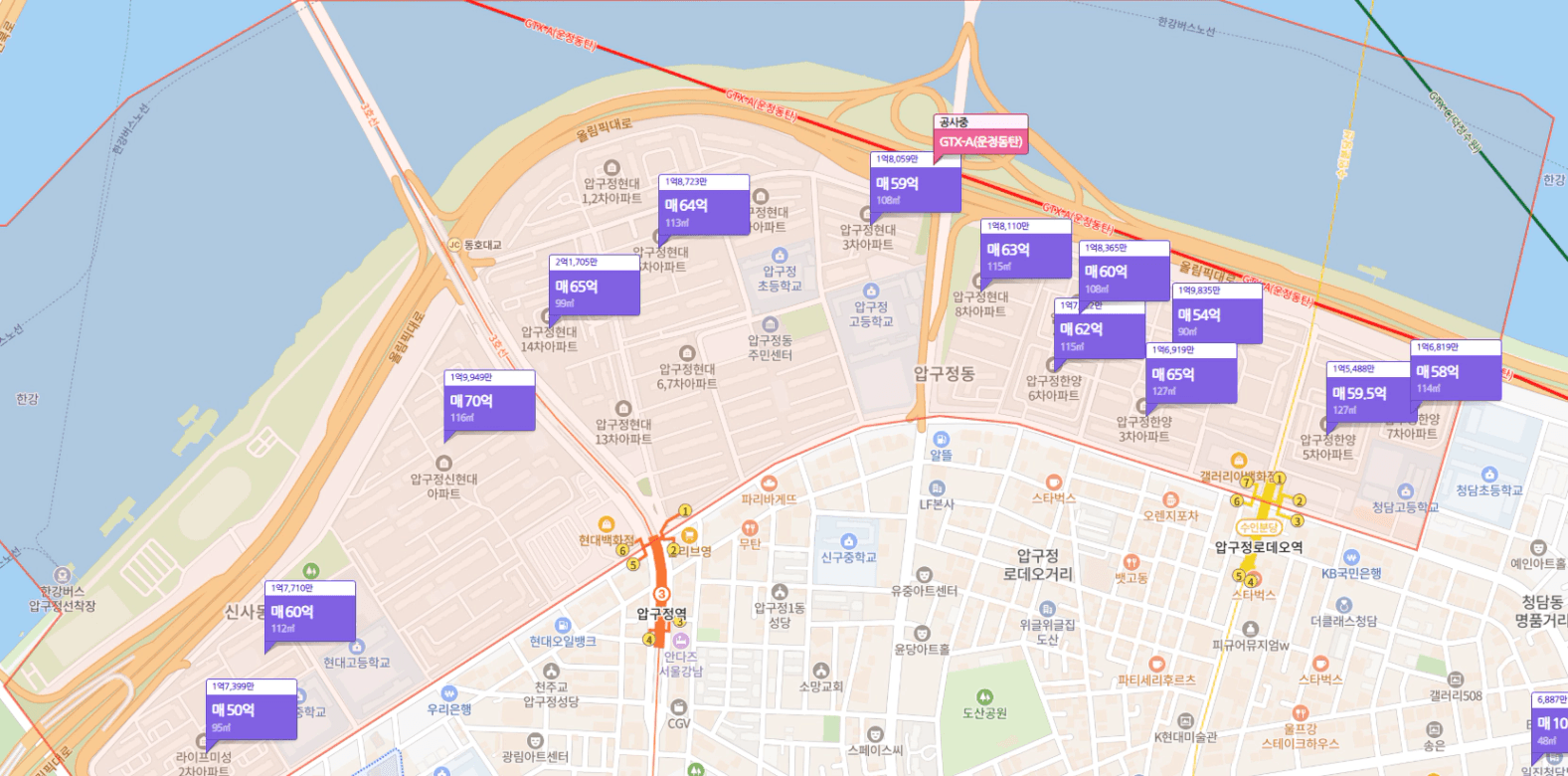 인근의 재개발/재건축 이슈가 있는 한남뉴타운, 압구정의 가격도 같이 살펴볼까요?