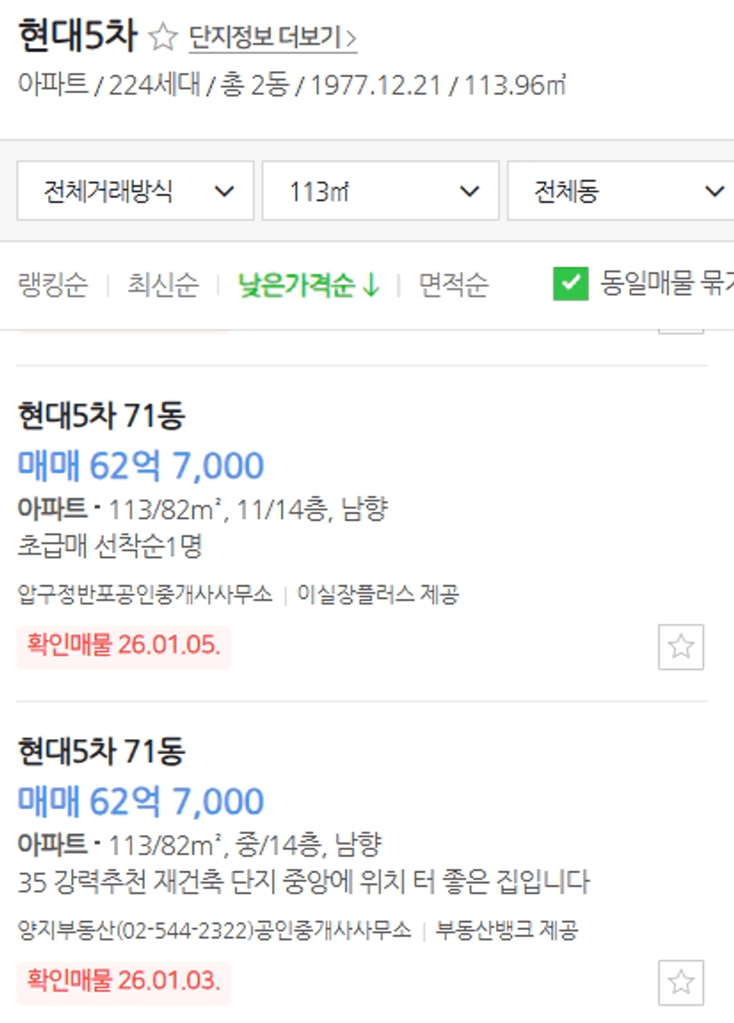 강남 재건축으로 유명한 압구정 현대는 60억대로 매물이 나오고 있습니다.