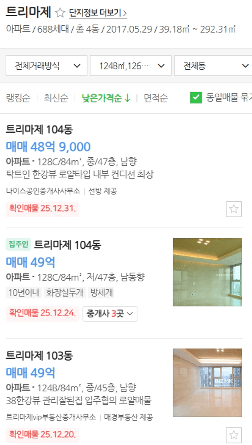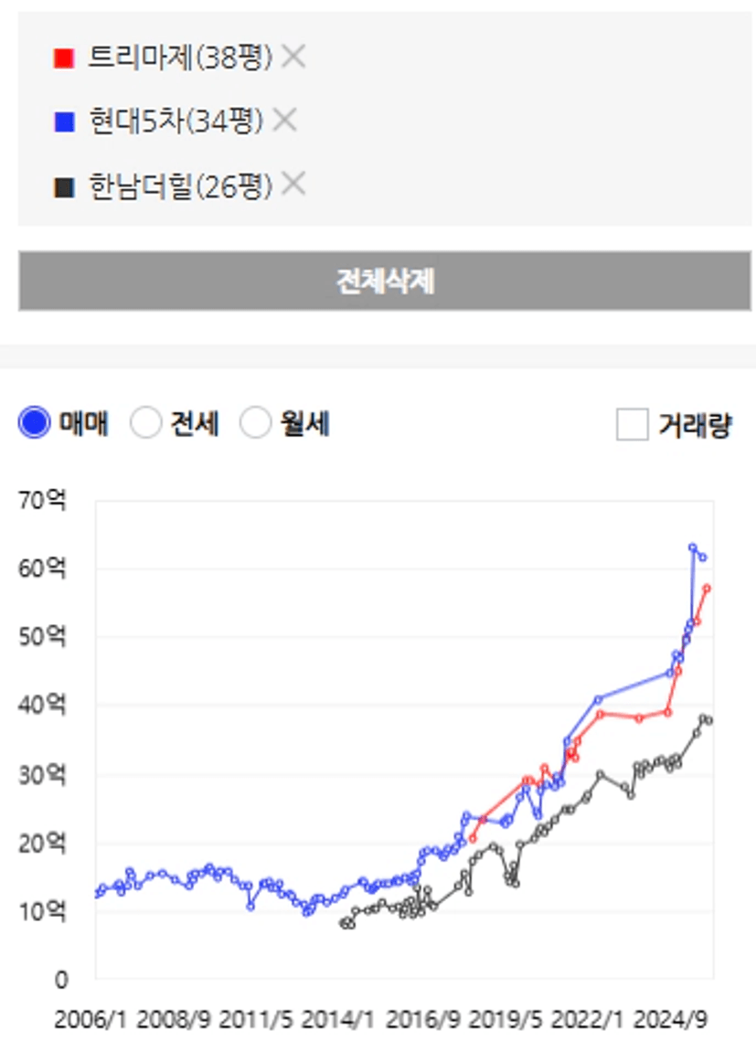 실제로 트리마제, 압구정 현대5차, 한남더힐의 가격을 봤을 때,