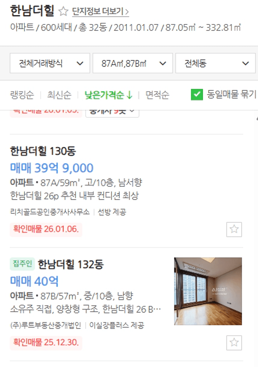 유명한 한남더힐이 59타입이긴 하지만 40억대에 호가가 나오고 있죠.