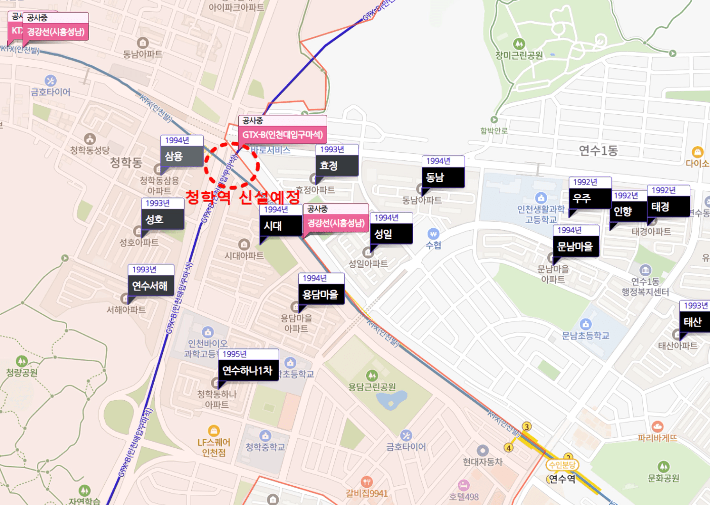 GTX-B 추가 개통 추진이 확정 된 이곳은 인천 연수구의 청학동이라는 곳에 위치하고 있습니다.