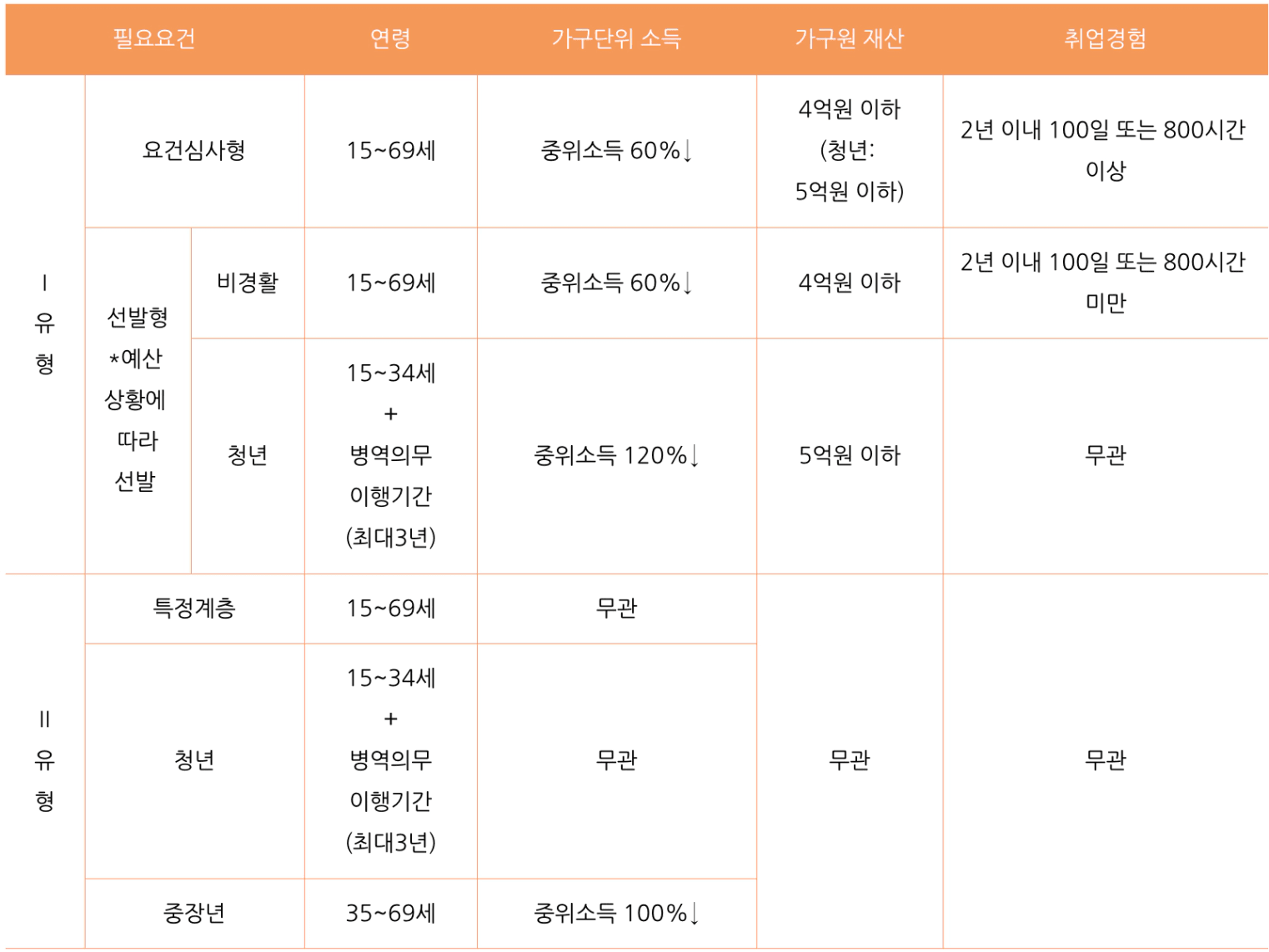 - 국민취업지원제도는 1,2 유형으로 나뉘며, 각각 지원조건이 다릅니다.