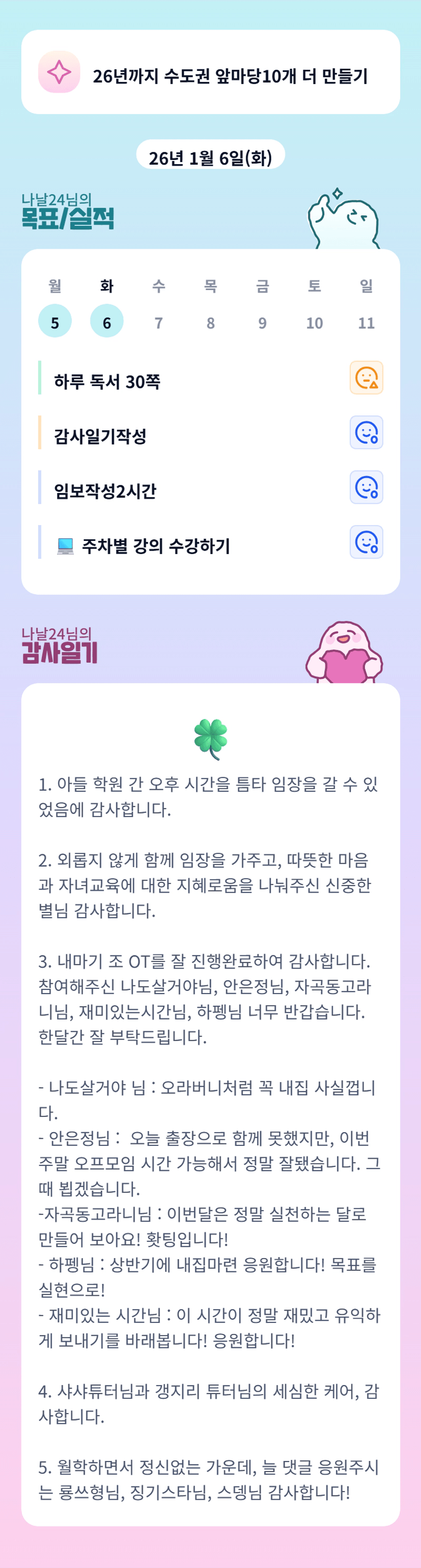 벌써 조ot하셨군요. 조원들의 목표응원 멋있습니다♡