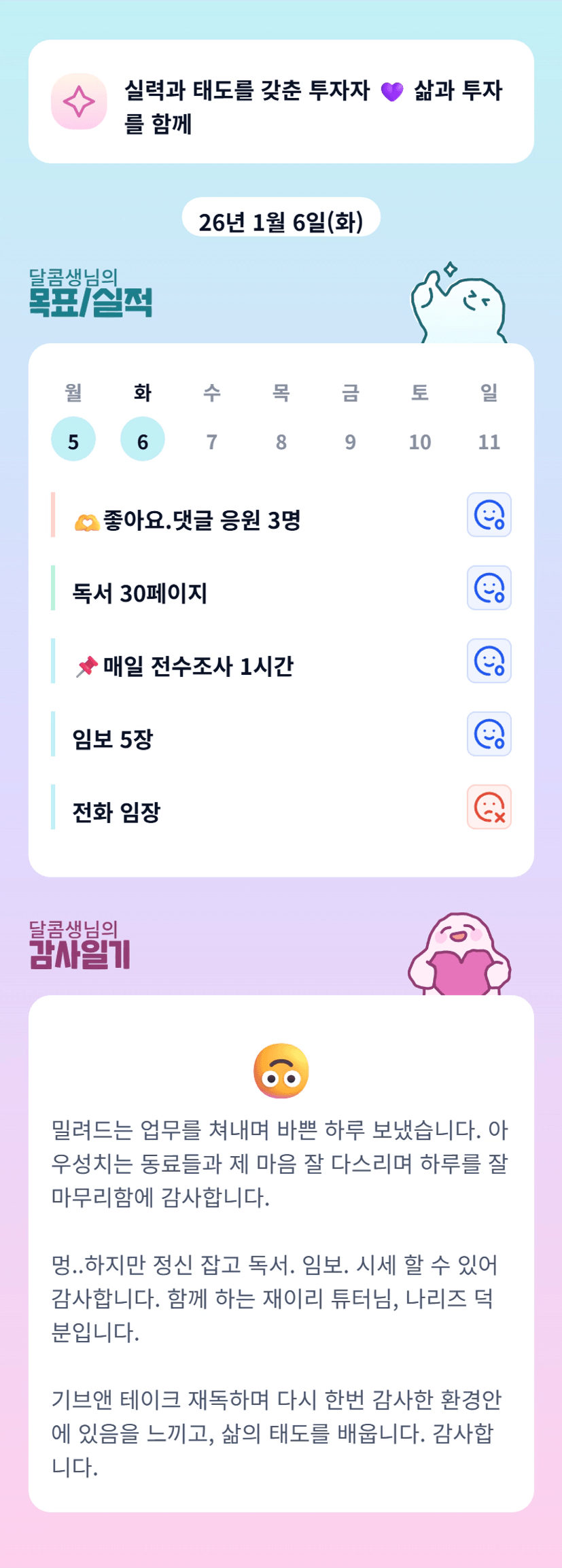 콤님 업무가 바쁘셨꾼요ㅠㅠㅠ 넘넘 고생많으셨습니다 정신잡고 독서 임보 시세 하신 콤님 대단하셔유 >< 저도 더 정신차리고 해야겠어요! 크크 감사합니다 오늘도 화이팅!!!!!