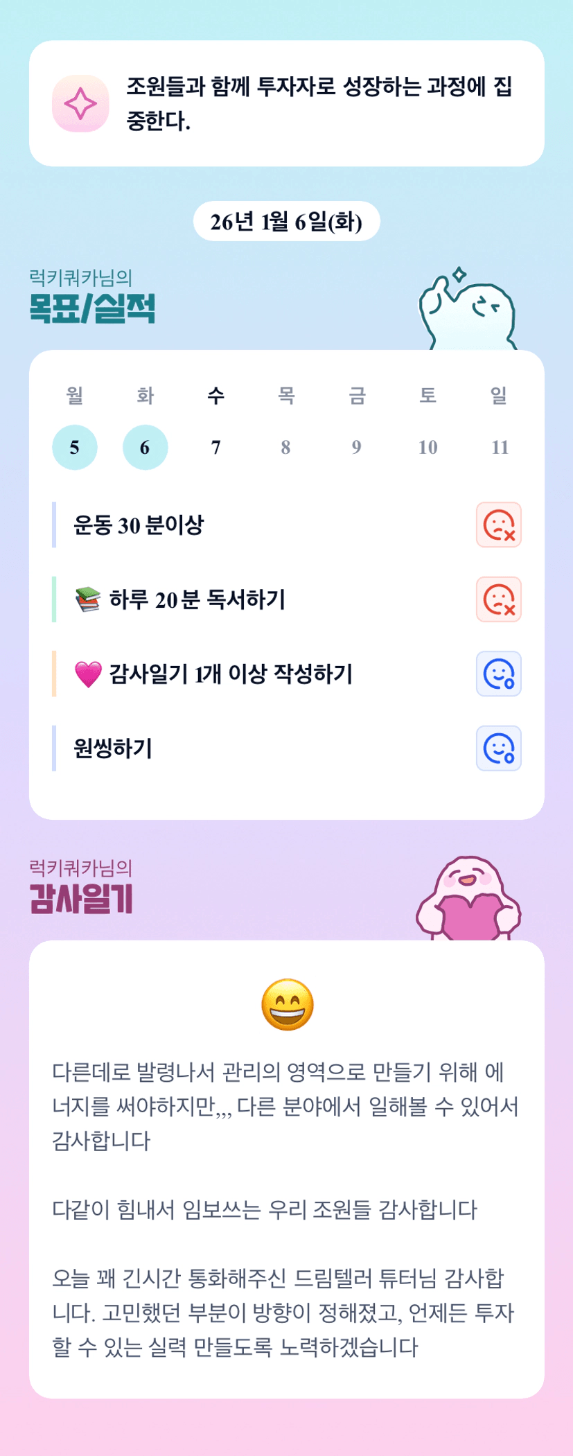우리 쿼카님~~ 직장에 변화가 있으시군요 이래저래 바쁘시겠어요~~ 날씨도 계속 추운데 건강 잘 챙기시면서, 직장에서도 하나 둘 챙겨가시며 천천히 자리잡으시길 응원할게요~ 다 할 수 있다! 쿼카님 화이팅!!♥