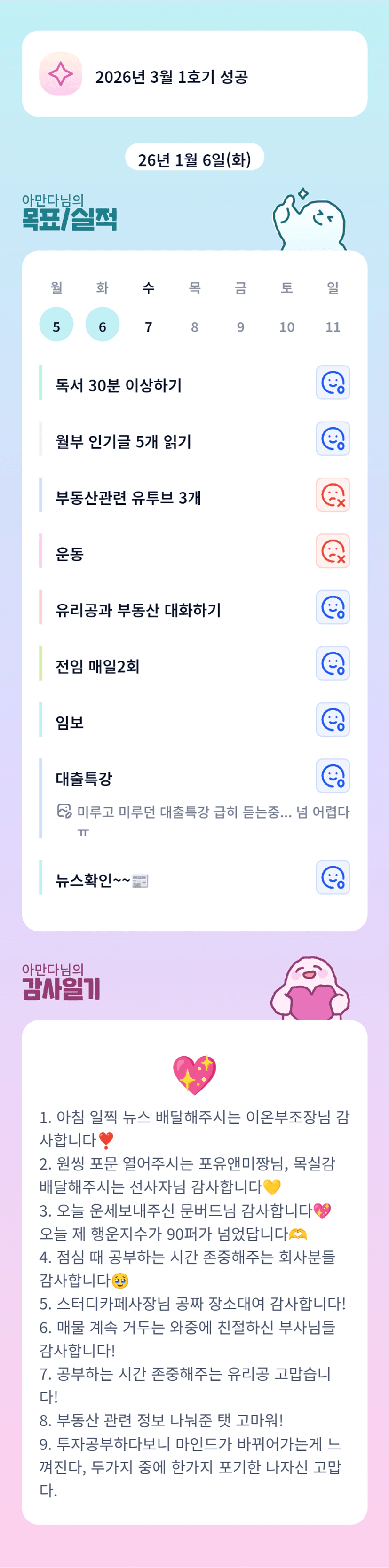 어제도 감사한 일로 가득한 아만다님의 하루가 너무 부럽습니당 ㅎㅎㅎㅎ 어려운 대출특강도 어떻게든 시작하시고 궁금한 것들은 마구마구 물어보시는 열정! 오늘도 응원 하겠습니다~~~ ><