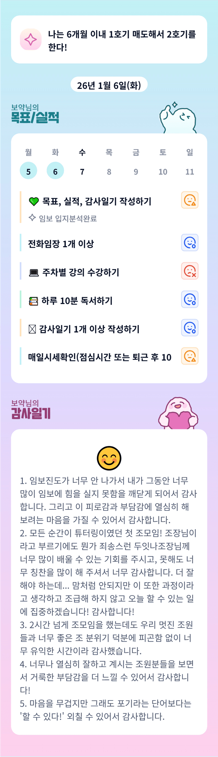 보약님~ 목실감에 절실함과 감사함이 넘치십니다. 전처럼 매일 인사 나누진 못하지만, 늘 응원하고 있으니 나중에 꼭 연락주세요~ 오늘도 너무 응원하고, 화이팅 입니다.