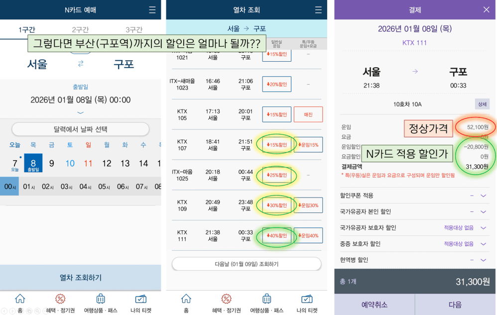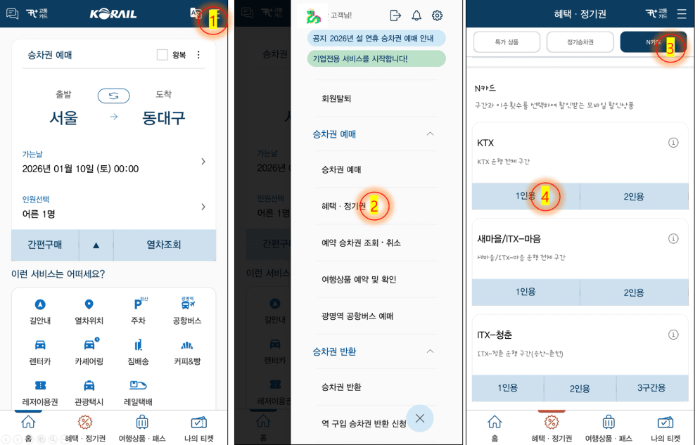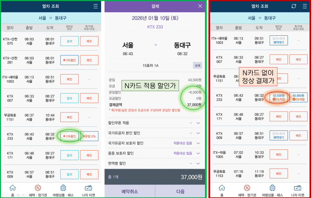 N카드는 코레일 어플에서만 신청 및 결제 할수 있어요