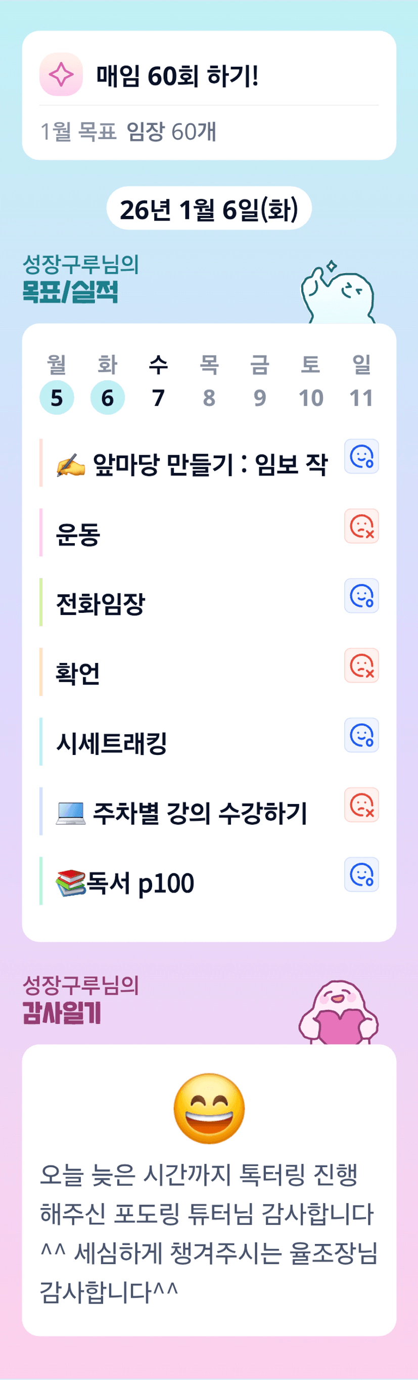 구루님 어제 하루도 고생 많으셨습니다 ㅎㅎ 구루님 덕분에 우리 반이 쫀쫀하고 안정적인 느낌🩷