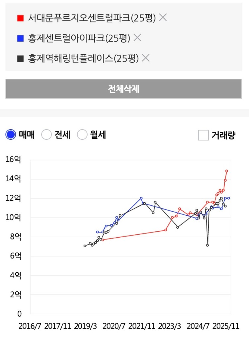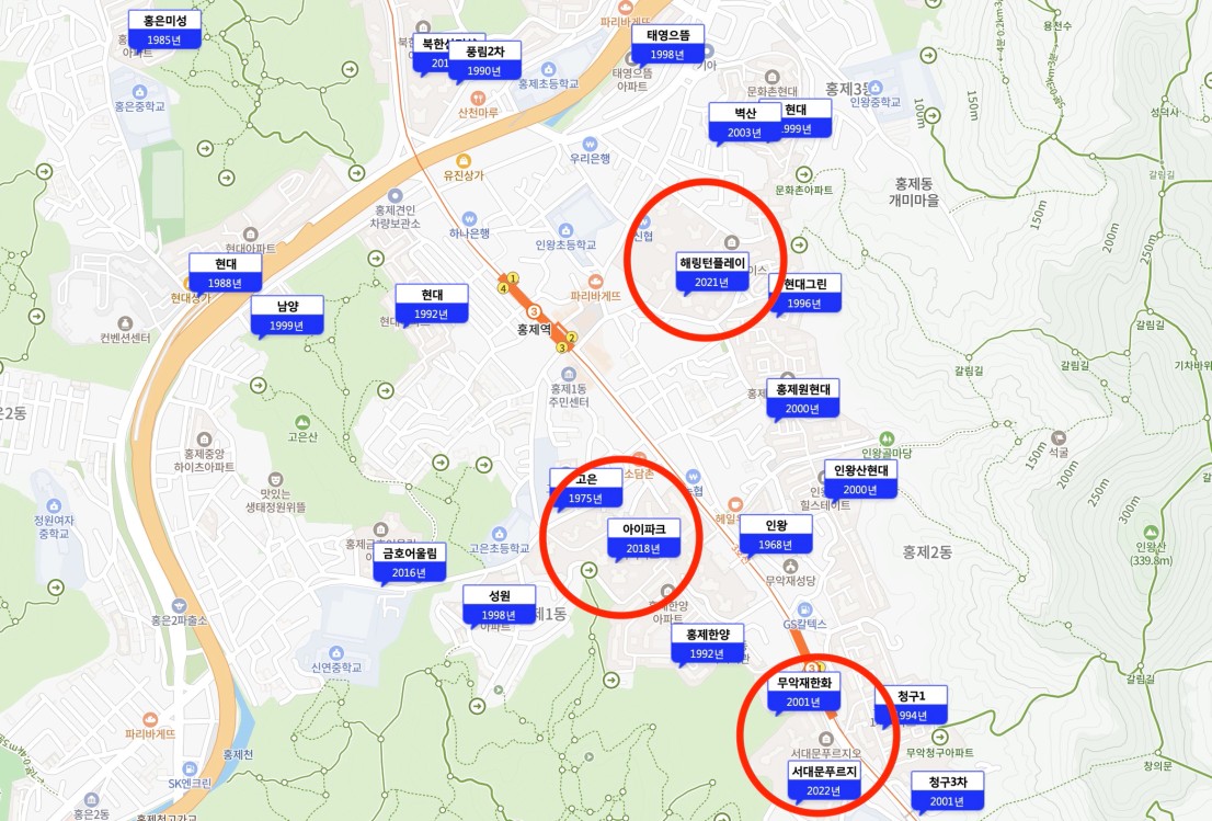 교통과 연식의 힘이 만나 비슷한 연식이지만 2~3억 차이의 호가를 보여주고 있는 신축 3인방도 보이기 시작하고, 00년식 홍제원현대와 인왕산현대 힐스테이트 두 형제들도 59 매물들을 모두 소진하고 84 가격을 올리고 있는 상황이었어요.