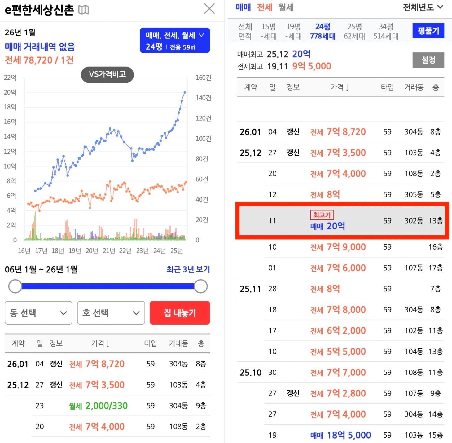 메인▶︎매매 18~20억대, 전세 7억대