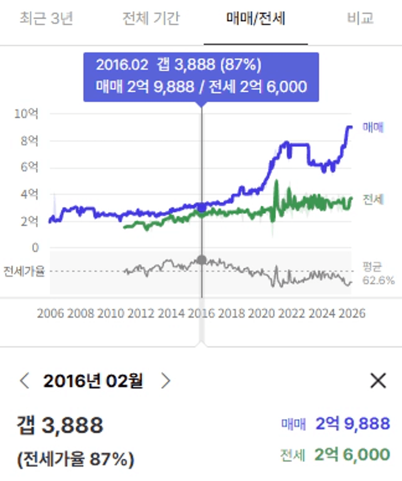 만기가 다가올 때 쯤에는 전세가는 오히려 약간 떨어졌는데 매매가는 20%이상 올랐습니다.