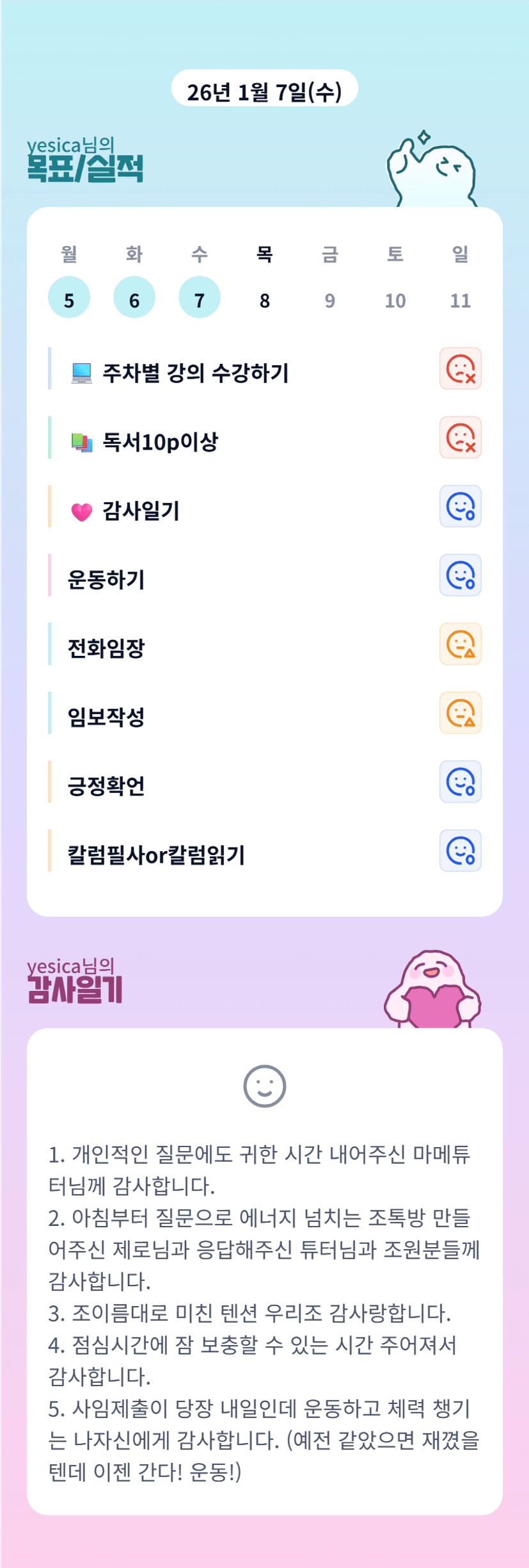저도 첫 실전반에서 루틴 다 재끼고 임보만 썼는데...담엔 그렇게 안하려구요..ㅠㅠ 루틴 중요성 실감..💛 운동 챙기신거 칭찬합니당 !!😊