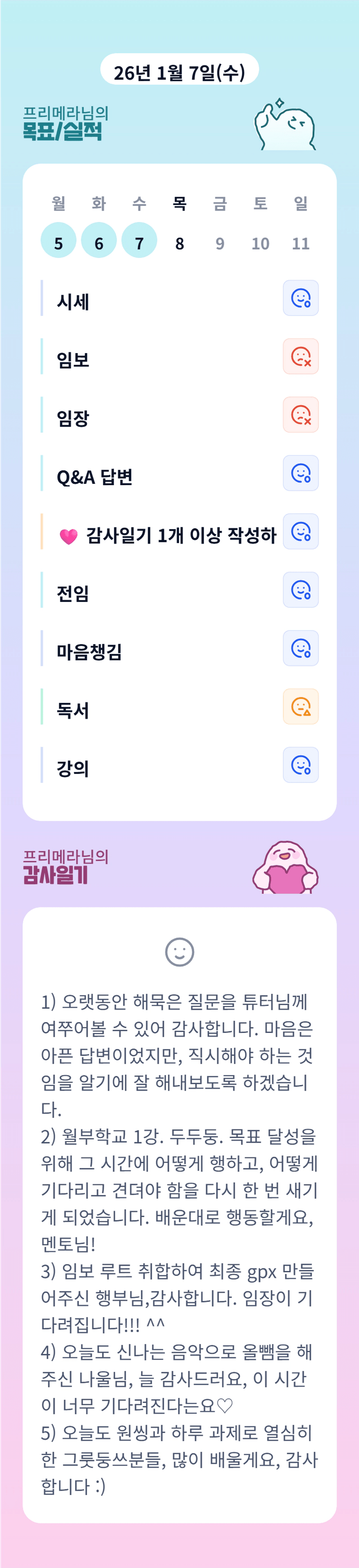메라님 공지글 보며 항상 박수치고 있읍니다 역씨 지난실전반 운영진이자 MVP의 빠워가 느껴지시는🏆🏆 매일 꼼꼼히 과제 챙겨주셔서 감사해요☺️☺️