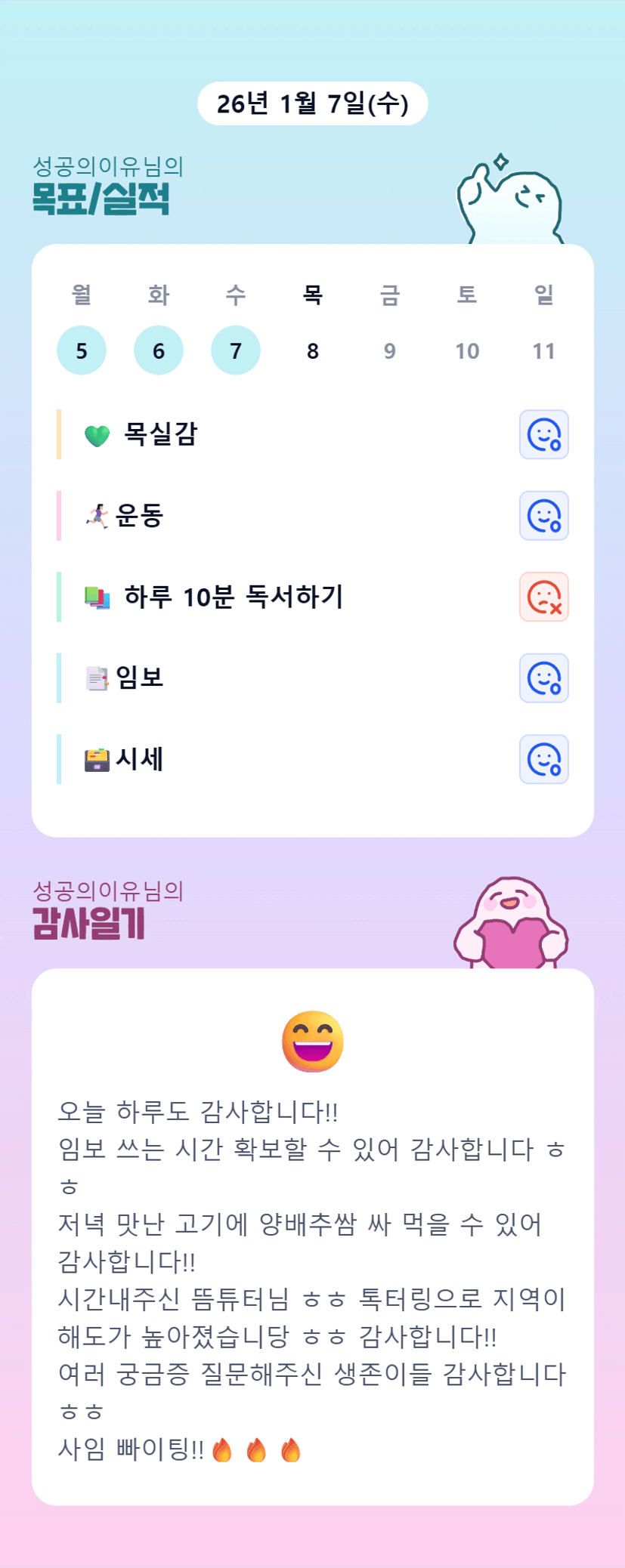 성공님, 고기에 양배추쌈이라니~ 완전 꿀조합이네요! 오늘 사임 제출하느라 정말 고생 많으셨어요. 톡터링 정리까지 깔끔히 챙겨주셔서 너무 감사합니다^^ 튜데이 때 뵈용~ 오늘 밤도 편안하게 마무리 하세요 🙌