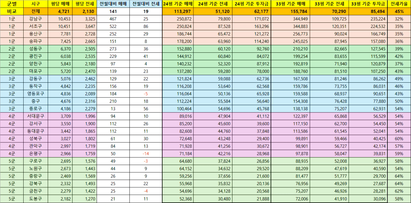 서울,수도권,광역시 매매/전세 평단가, 투자금 및 전세가율을 정리하였으니,