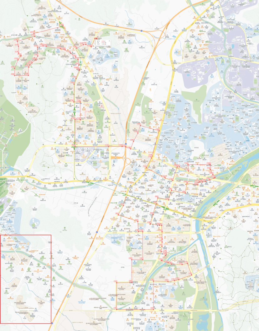 2) 주요 상권과 아파트 밀집 지역을 지날 수 있게
