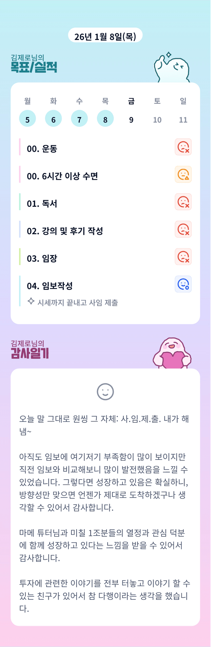 매일매일 발전하고 성장하는 제로님이라는 게 느껴져요~ 저도 제로님께 자극받아 동기부여 됩니다. 선한 영향력 전파해주셔서 감사해요 : ) 오늘도 성장캐 제로님 홧팅!!