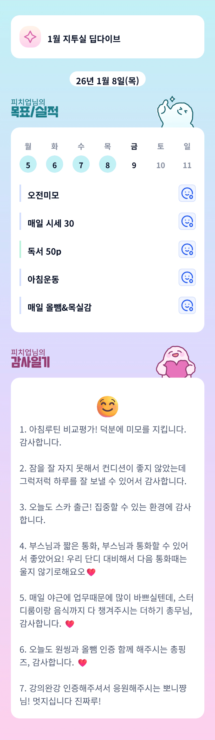 감사가득한 피치업님 일기 읽으니 저도 덩달아 기분 좋아지네요~ 화이팅입니다!!❤️