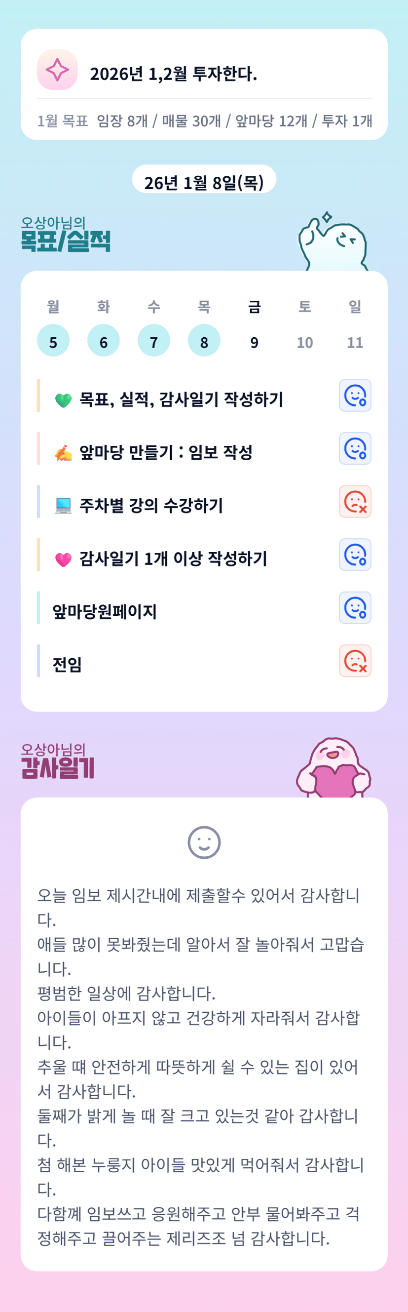 아이들 케어하면서 사임까지 제출하시느라 고생하셨어요 상아님! 토요일에 봬요!