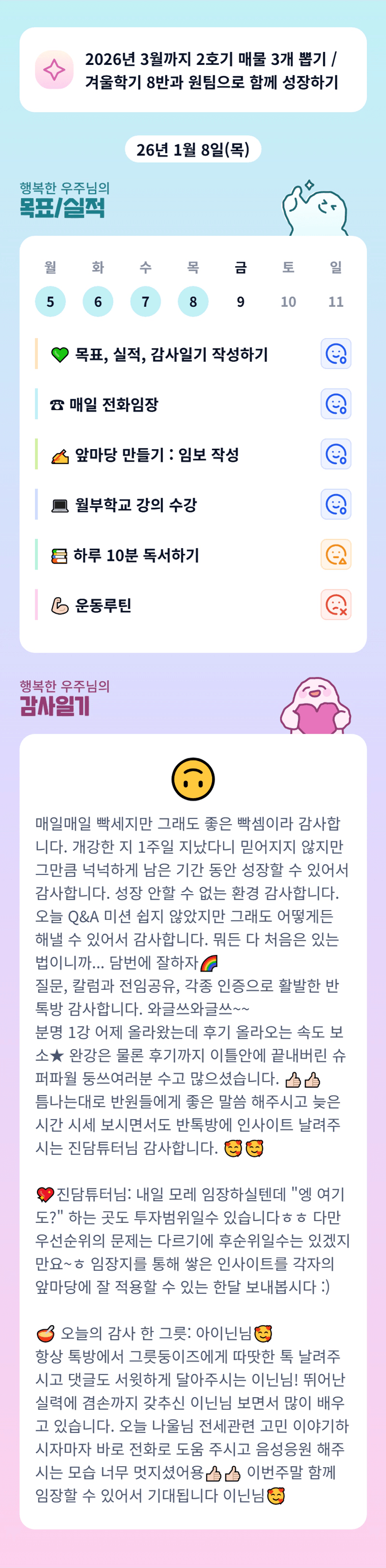 전 늘 한결같으신 우리 행부님이 넘 기대되요.☺️ 완강과 후기 작성 그리고 매일 매일 빅재미를 선사해주셔서 너무 감사해요😊😁 오늘도 화이팅입니다🔥