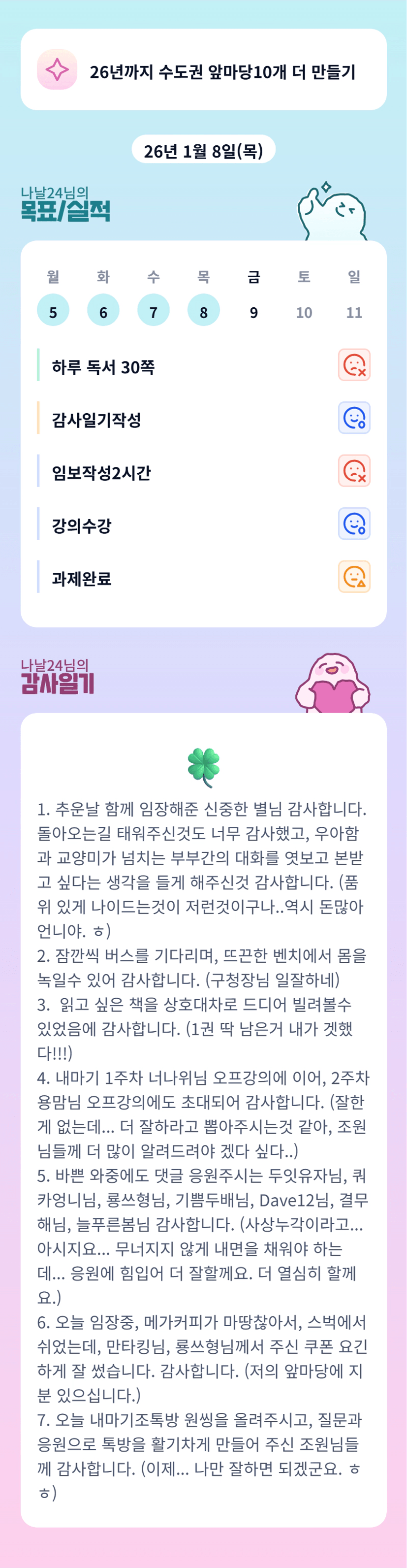 특히 감사 일기를 작성하면서, 오늘 어떤 감사함들이 있었는지 천천히 생각해 보면서, 참 감사함이 많은 하루였구나 라고 생각하며 마음이 충만해짐을 느끼게 되었습니다.