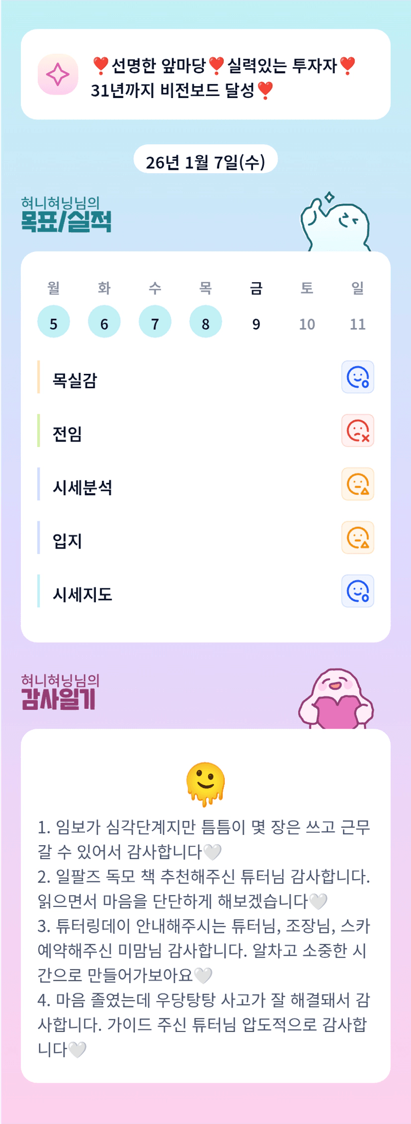 오오 잘 해결되셨군요 다행이에요 혀닝님!! ㅎㅎㅎ 정말 울 튜터님이랑 함께하고 있는게 럭키네요 🍀 혀닝님 넘 고생 많으셨어요 오늘두 홧팅💛