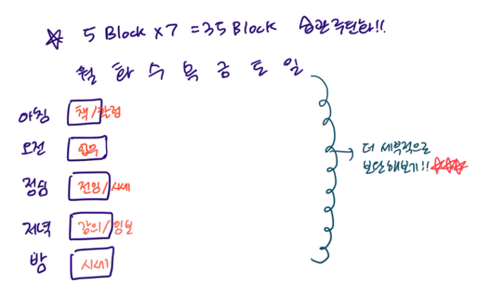 1일 5블록 x 7일 = 35블록으로 쪼개서 나의 시간을 잘 활용해보라고 하셨습니다