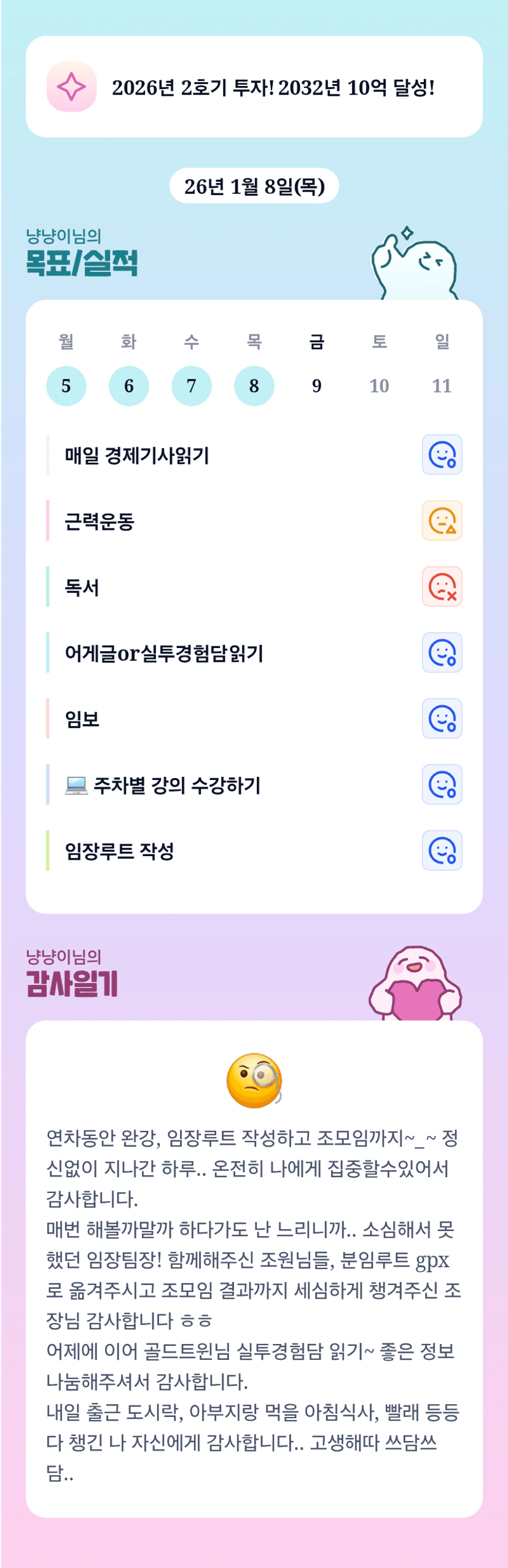 냥이님 진짜 넘넘 고생 많았어요~!! 너무 잘 해주고 계셔서 감사할 따름이에요!! 이번에 임장팀장 벽 깼다아 🌟🌟🌟