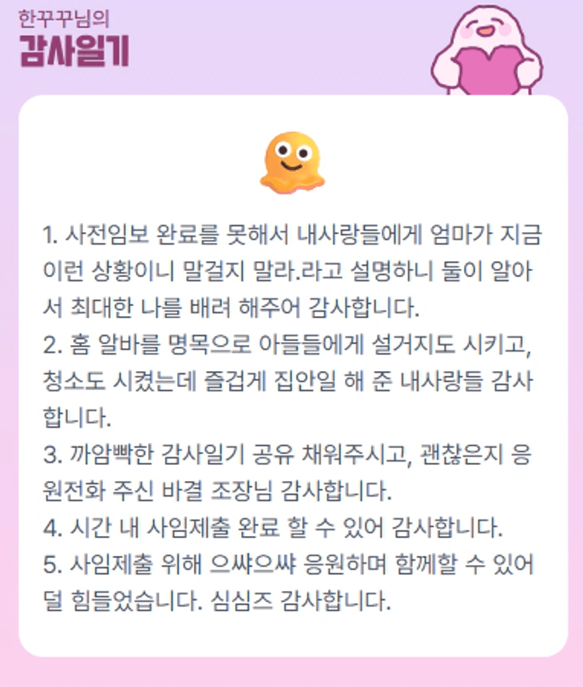 꾸꾸님 사임제출하시느라 고생 많으셨습니다~ 자녀분들이 말을 잘 들어주어서 너무너무 고맙고 기특하고 예쁘네용 ^^